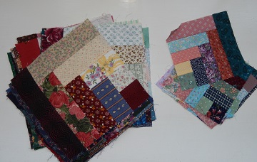 I’ve joined the 100 individual squares into sets of four squares each, taking care to make sure that I don’t have the same fabrics next door to each other.