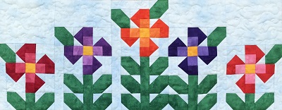 Susan started fiddling around in her spare time this spring with a drawing for these easy pieced flowers, and decided that it would be fun to use them in a medallion-style quilt, rearranging the flowers and stems to surround a central block, called “Four Winds”. (You’ll be seeing more of “Four Winds in November!)