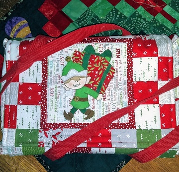 I started by creating a patchwork outer cover, with our “Gifty Elf” applique on a 7″ square of background fabric. I framed the square and then used a set of 5″ precut squares from Moda (cut down to make 2.5″ squares) to enlarge my piece into a rectangle large enough for the cover. I followed the easy instructions to make the rest of my casserole carrier. I can’t wait to use my new casserole carrier!
