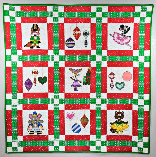 As we were choosing a project to feature for this blog hop, we spent some time looking at previous efforts. Wow! We have a LOT of quilts that feature stripes! From binding, to sashing, to piecing, to appliqued animals, there are stripes galore in Ms P’s portfolio. We’re literally showing our stripes with this slide show: