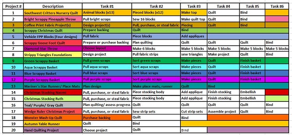 This project has remained stalled for nearly a year, and I finally realized why. My task list says “Make more blocks“, and I need 41 more blocks for the design that I’m planning. That’s a LOT of blocks to sew, so it’s no wonder that I haven’t managed to cross that step off my to-do list! I’m going to break it down into smaller steps of “Make 5 blocks“, which will allow me to see my progress, thus encouraging more progress. Does that make sense? I probably won’t finish the project this year, but if I can get some of the blocks stitched then I’m fine with that idea.