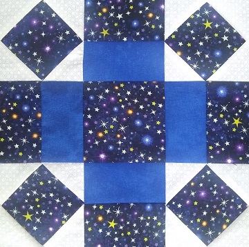 Here’s my pretty BLUE Rolling Stone block, and I chose this dark blue fabric because I love those glow-in-the-dark stars –
