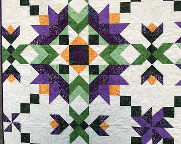 This design comes together easily with precision quick piecing and a little bit of foundation piecing. We used a selection of purple, green, and gold batik fabrics, but you could choose your favorite colors to make it your own.
