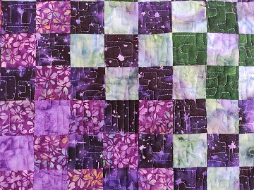 I used several orphan blocks to create the center of the quilt, and then added a purple batik border. I quilted a “Circuitboard” FMQ design with matching purple thread. This was my first attempt at this design, so my matching thread doesn’t show the bobbles that inevitably happen on the first try at a new FMQ pattern. The border is straight-line quilted, and the binding matches the border.