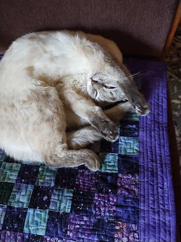 All done; I made this little quilt from orphan blocks, scraps, and stash fabrics to shield the chair from kitty hair. Katniss says that it’s purrrr-fect.
