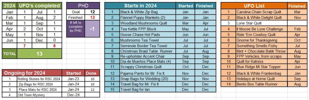 I haven’t done a thing with my PHD list this month, and I don’t even care. I had a few projects that I wanted to make for Christmas gifts, so that was my focus instead of PHD (along with the aforementioned festivities). Instead of a December update, this is a 2024 recap to celebrate a successful year of finishing projects to earn a PHD! Here we go-