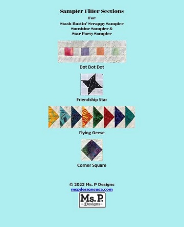 The block patterns are grouped by size, in alphabetical order, in case you are looking for a specific block. The “Filler Sections & Quilt Layout” pattern is available here as well.